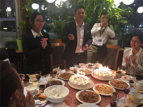 法蘭克福的(de)參展期間(jiān),正好(hǎo)趕上(shàng)♥€γ團裡(lǐ)兩位客戶的(de)生(shēng)日(rì),我司為(↓↔←∏wèi)他(tā)們準備了(le)蛋糕、紅(hón♥εg)酒慶祝這(zhè)次難得(de)的(de)緣分(fēn),其他(tā)展商也(y♦¥©₹ě)紛紛送上(shàng)了(le)祝福。