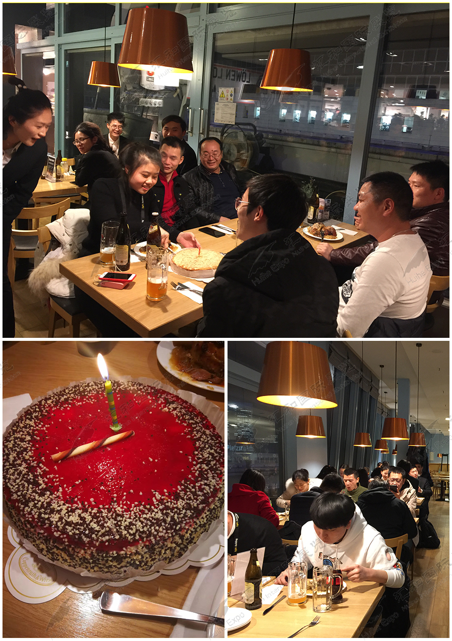 此次展會(huì),我司共組織五十家(jiā)企業(yè)參展,參展人(rén)數(shù)→←達150人(rén),10.1和(hé)10.2展出總面積達430平,展₹™商一(yī)半是(shì)老(lǎo)客戶,也(yě)有(yǒu)大(dà)量新♣φ×φ客戶的(de)加入,充分(fēn)體(tλλ±ǐ)現(xiàn)企業(yè)對(duì)我∑♦ε司的(de)信任。因為(wèi)參展人(rén)數(shù)比較多(duō)↑♥<,此次出團我司派了(le)三位領隊,安排3輛(liàng)大(dà)巴車(chē)專門(mén)×®∞接送客戶往返酒店(diàn)和(hé)展館,展會(huì)一(yī)切順利,展商對(duì)參展效φδ✘果也(yě)都(dōu)非常滿意。為(wèi)了(le)感謝(xiè)新老(l★÷ǎo)客戶的(de)支持,我司特意安排體(tǐ)驗了(le)當地(dì)餐,豬肘、德國≠☆∞'(guó)碑酒,幸運的(de)是(shì)我們團裡(l<€×ǐ)還(hái)有(yǒu)幾位壽星,領隊特意精心給每位壽星準備了(le)生(shēn"φ♦g)日(rì)蛋糕,他(tā)們在異國(guó)他(₽®γtā)鄉(xiāng)收到(dào)了(le)意外(wàiγ★φ)的(de)驚喜,給每位團員(yuán)分(fēn)享了(le)蛋>★λ♥糕,伴随著(zhe)豬肘、碑酒、蛋糕,大(dà)家(jiā)度過了(le)一(yī) '個(gè)難忘的(de)夜晚。